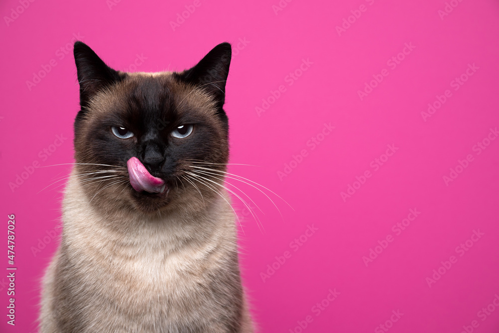 Seal Point Siamese Cat Looking At Camera Hungry Licking Lips Portrait On Pink Background With Copy Space Stock Photo Adobe Stock